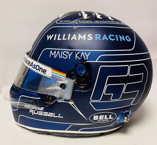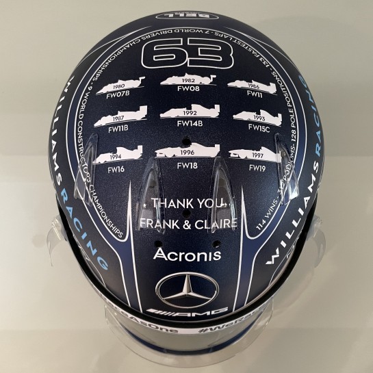 The helmet is based on Russell's basic 2020 scheme but colored in Williams dark blue matte and matte glitter, with a display on the top of all the Grove-based outfit's championship winning cars.