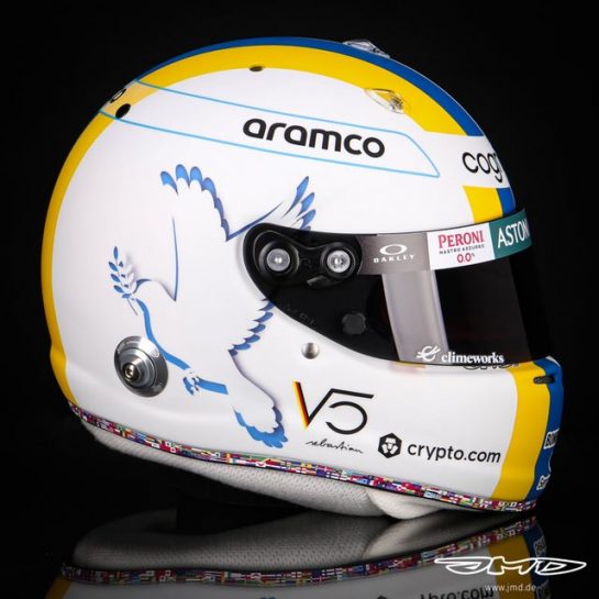 After Wednesday evening's gesture of solidarity for Ukraine by F1's drivers in bahrain, Sebastian Vettel has gone one step further, with the Aston Martin driver sporting in testing this week at Sakhir a special 'No War' helmet design.
