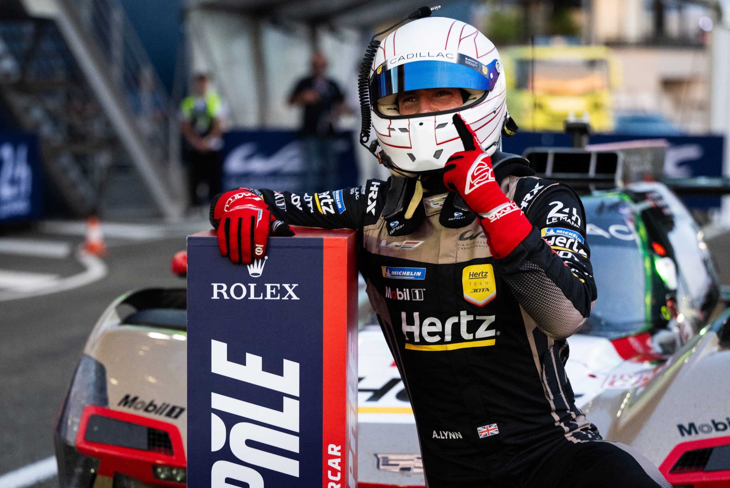 Cadillac Hertz Team Jota's Alex Lynn celebrating pole position after the final Hyperpole shootout at Le Mans.