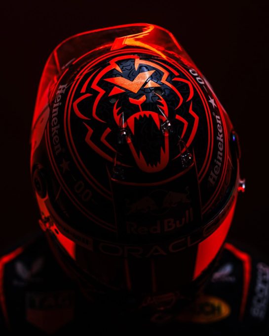 Unveiled with a cheeky grin alongside his good friend and countryman, DJ extraordinaire Martin Garrix, the bold design ditches Max’s usual vibe for a navy-and-orange masterpiece that screams speed and style, perfectly syncing with his Red Bull beast.
