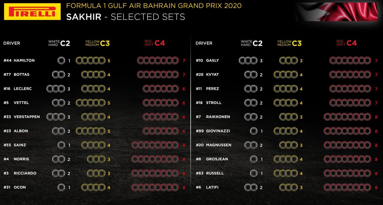 Furthermore, with regard to Pirelli's medium tyre, choices are staggered among the top teams' drivers, with Lewis Hamilton, Sebastian Vettel and Alex Albon set to received 5 sets of the yellow compound with their respective teammates taking on 4 sets of the C3 rubber.