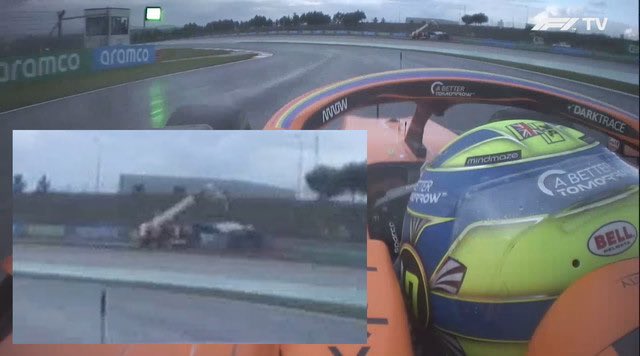 The Q2 wet session which had previously been halted resumed, but the crane had not yet been placed out of harm's way. Drivers were warned to approach the corner with caution by double waved yellow flags.