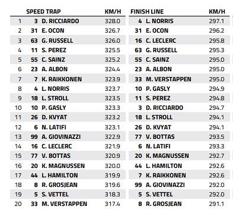 Daniel Ricciardo's Renault was the field's fastest car down Sakhir's main straight with a top speed of 328 km/h and was unsurprisingly followed by the R.S.10 of teammate Esteban Ocon. The pair qualified respectively sixth and seventh.
