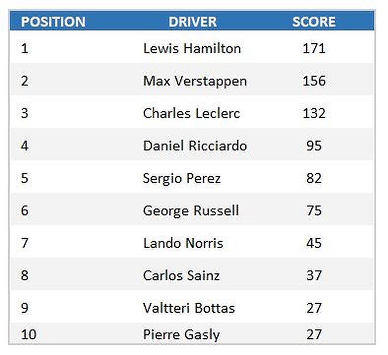 The vote was anonymous unfortunately, so we won't know who voted how much for whom. But the points total was nevertheless compiled to form a ranking that was logically topped by seven-time world champion Lewis Hamilton.