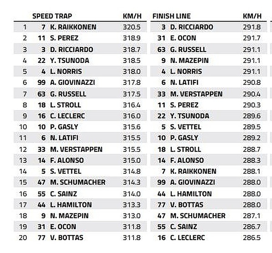 At 320.5km/h, Alfa Romeo's Kimi Raikkonen topped the speed trap readings - registered between Turns 3 and 4 - by a comfortable margin and almost 3km/h faster than last week's maximum speed, courtesy of McLaren's Daniel Ricciardo.