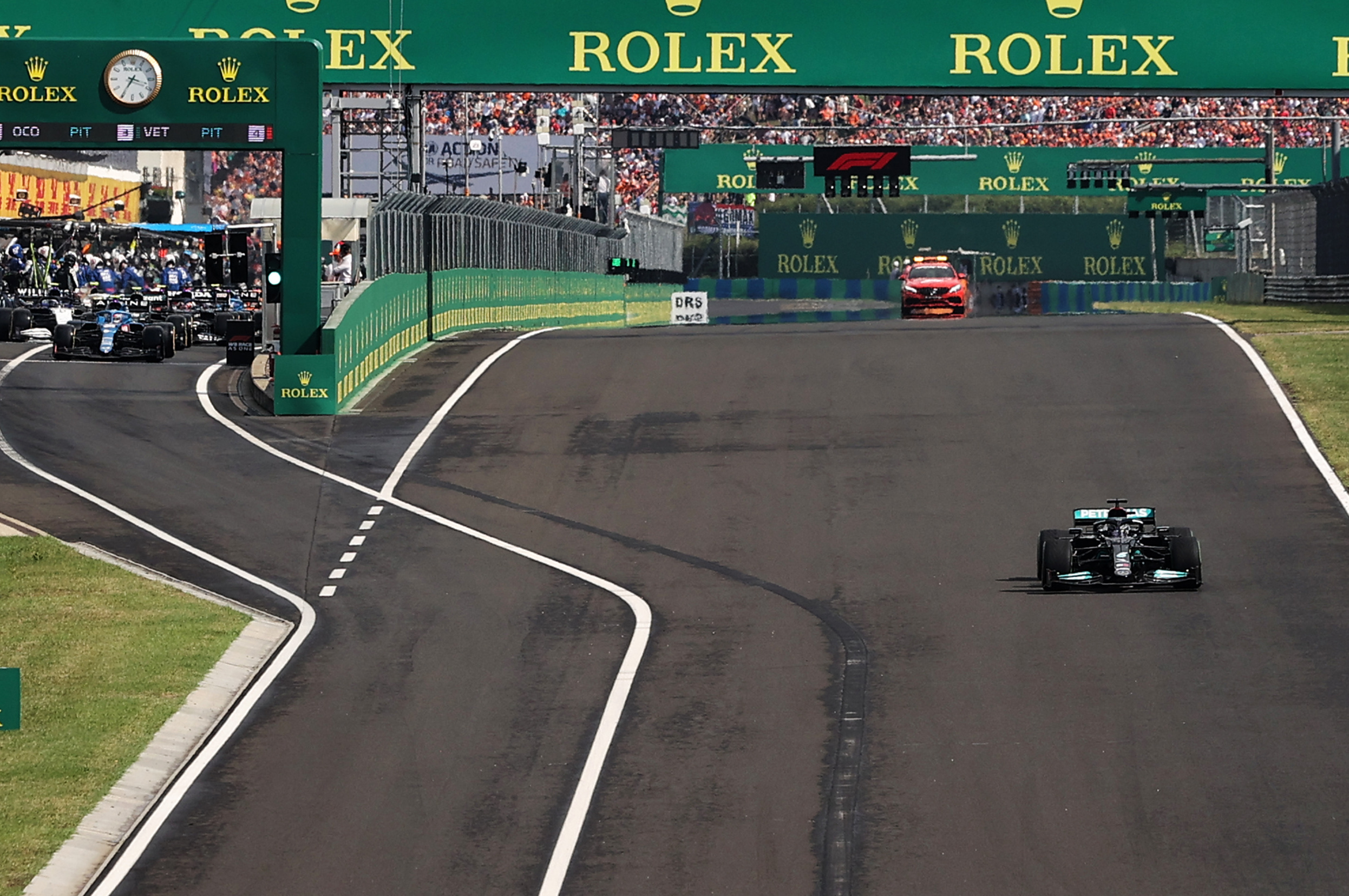 The second standing start at the Hungaroring was the scene of a historic first for Formula 1, with a single car - Hamilton's Mercedes - lining up on the grid while the remainder of the field was in the pits undergoing tyre changes.