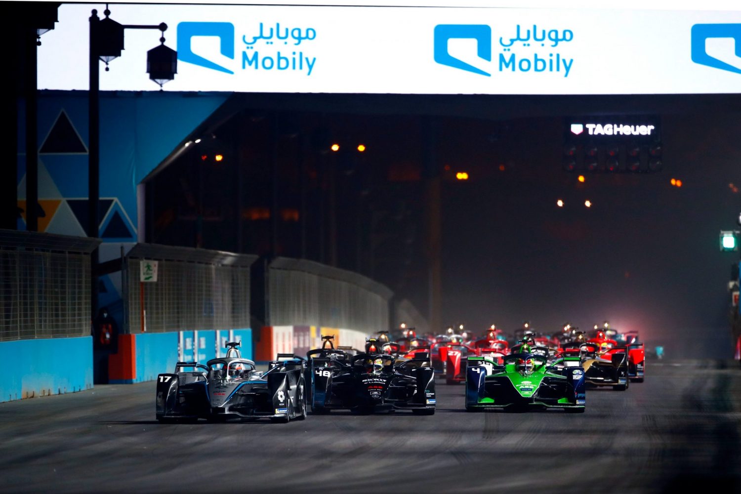 Eduardo Mortara claimed his third career win in Formula E in Saturday's second round of racing in Diriyah, the Venturi driver leading the field across the finish line after a late safety car period neutralized the race.