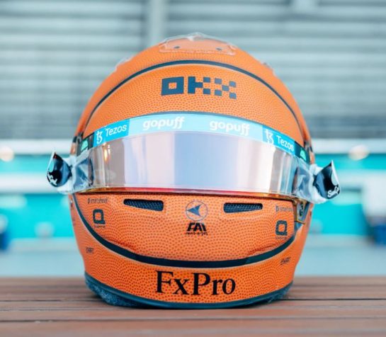 The McLaren driver has gone from track to court with his special Miami Grand Prix helmet design, which remarkably replicates the NBA's official basketball, supplied to the series by Wilson.