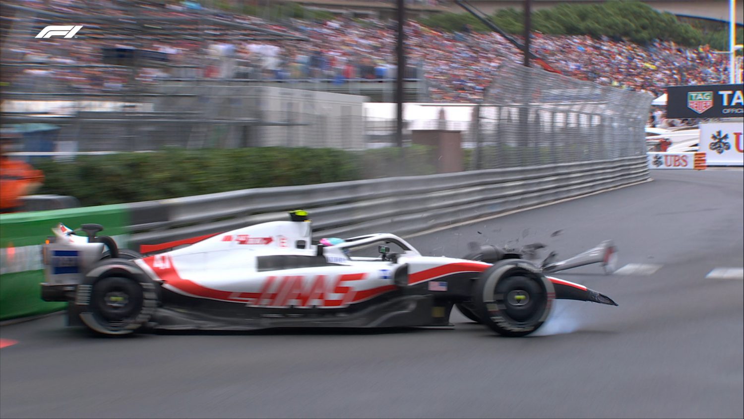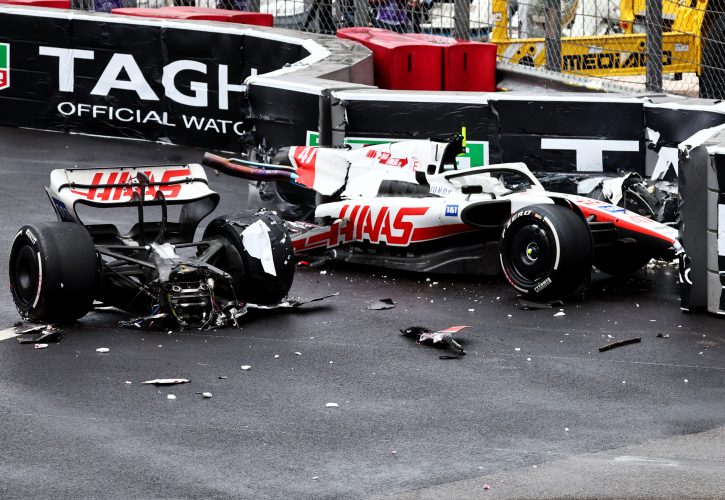 Schumacher lost control of his VF-22 on the exit of Turn 14, spun and heavily hit the TecPro barrier at the Swimming Pool complex, a 22G impact that pulverized the Haas, separating the gearbox assembly from its chassis.