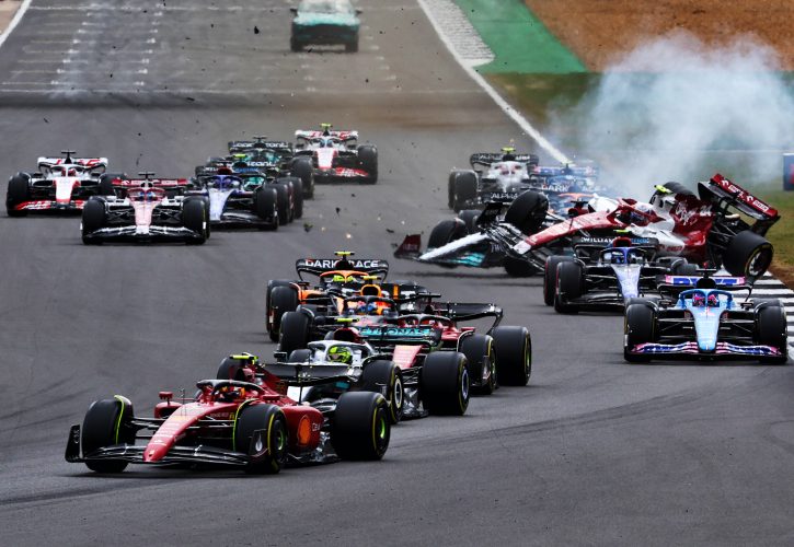 Congestion at the start of the British Grand Prix in the middle of the field led to a contact between the AlphaTauri of Pierre Gasly and the Mercedes of George Russell.