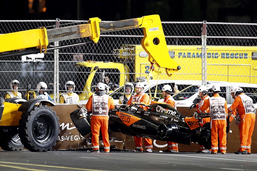 Lando Norris made an early exit from today's Las Vegas Grand Prix after his McLaren snapped into a scary accident and a hard hit in turn 12 on lap 3, immediately after a Virtual Safety Car for a general clear-up.
