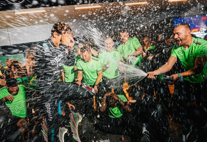 On Russell’s cool-down lap, Mercedes team boss Toto Wolff suggested they celebrate after flying back to Los Angeles later that night.