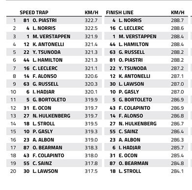 Oscar Piastri and Lando Norris were fastest up the hill to Turn 4 and the latter was quickest overall in Q3 – suggesting that the MCL39 has both top-end speed and strong downforce efficiency.