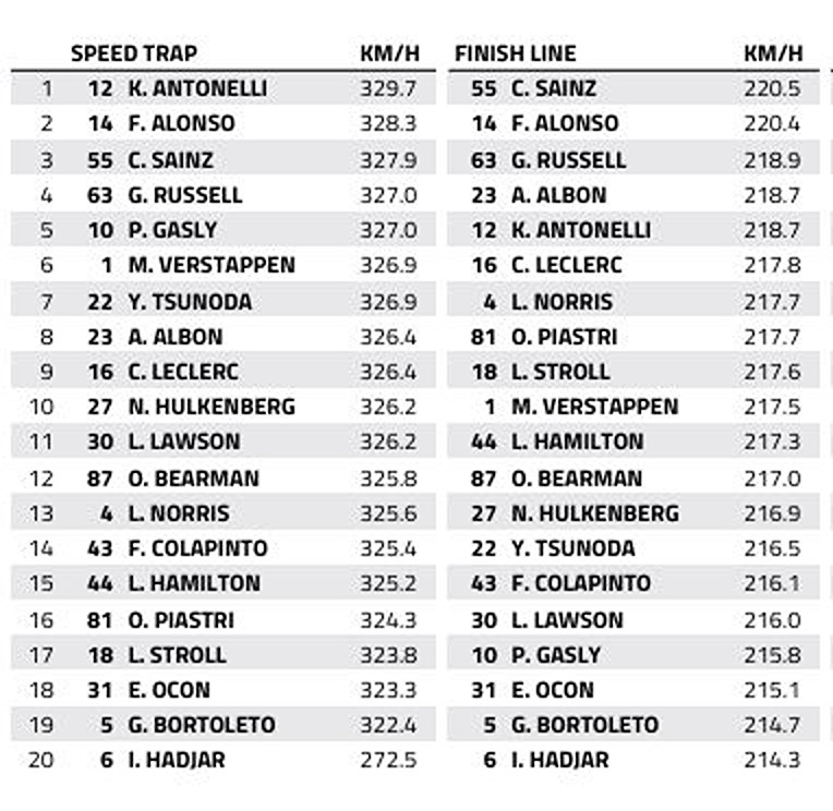 Kimi Antonelli’s Mercedes breezed past the speed trap located between Turns 11 and 12, a crucial DRS zone, with a maximum velocity of 329.7 km/h, but the Italian qualified only 7th, three position behind his teammate George Russell who was slower on the straight by almost 3 km/h.