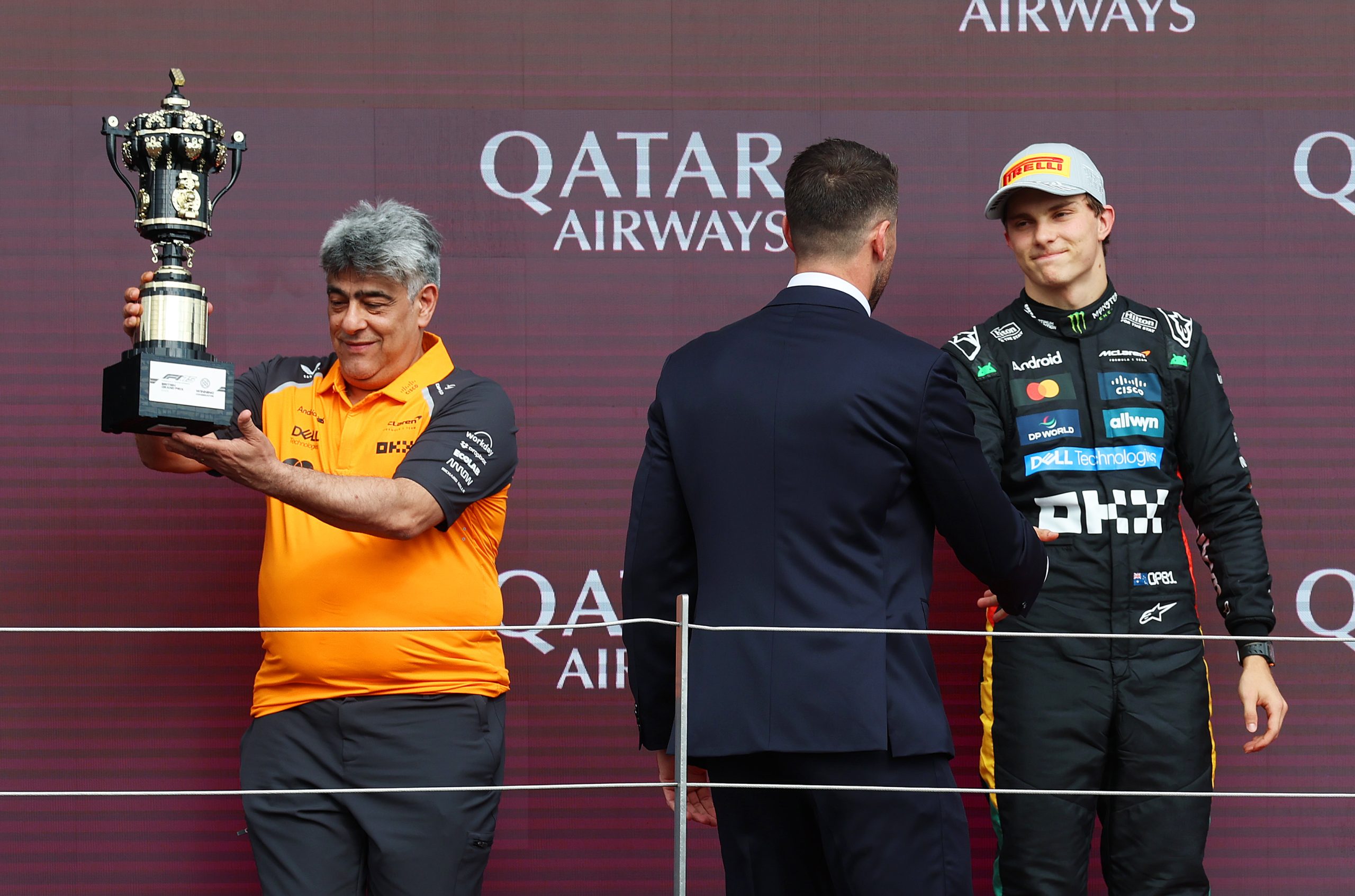 McLaren technical director (aerodynamics) Peter Prodromou collects the Constructors trophy on the podium at the 2025 British GP.