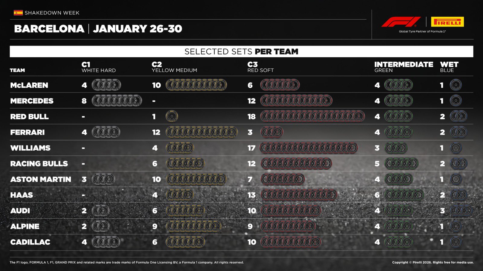 With a five-day shakedown at the Circuit de Barcelona-Catalunya looming, the tyre supplier has released the compound allocations for each team, uncovering a fascinating spread of strategies as the new challengers prepare for their first public outing.